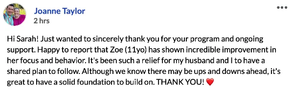 Sarah's expertise shines through in every aspect of the Calm ADHD Blueprint. The support we received was top-notch. We've seen remarkable improvements in our daughter's behavior and our family dynamics. This guide is a must-try for parents of ADHD children.